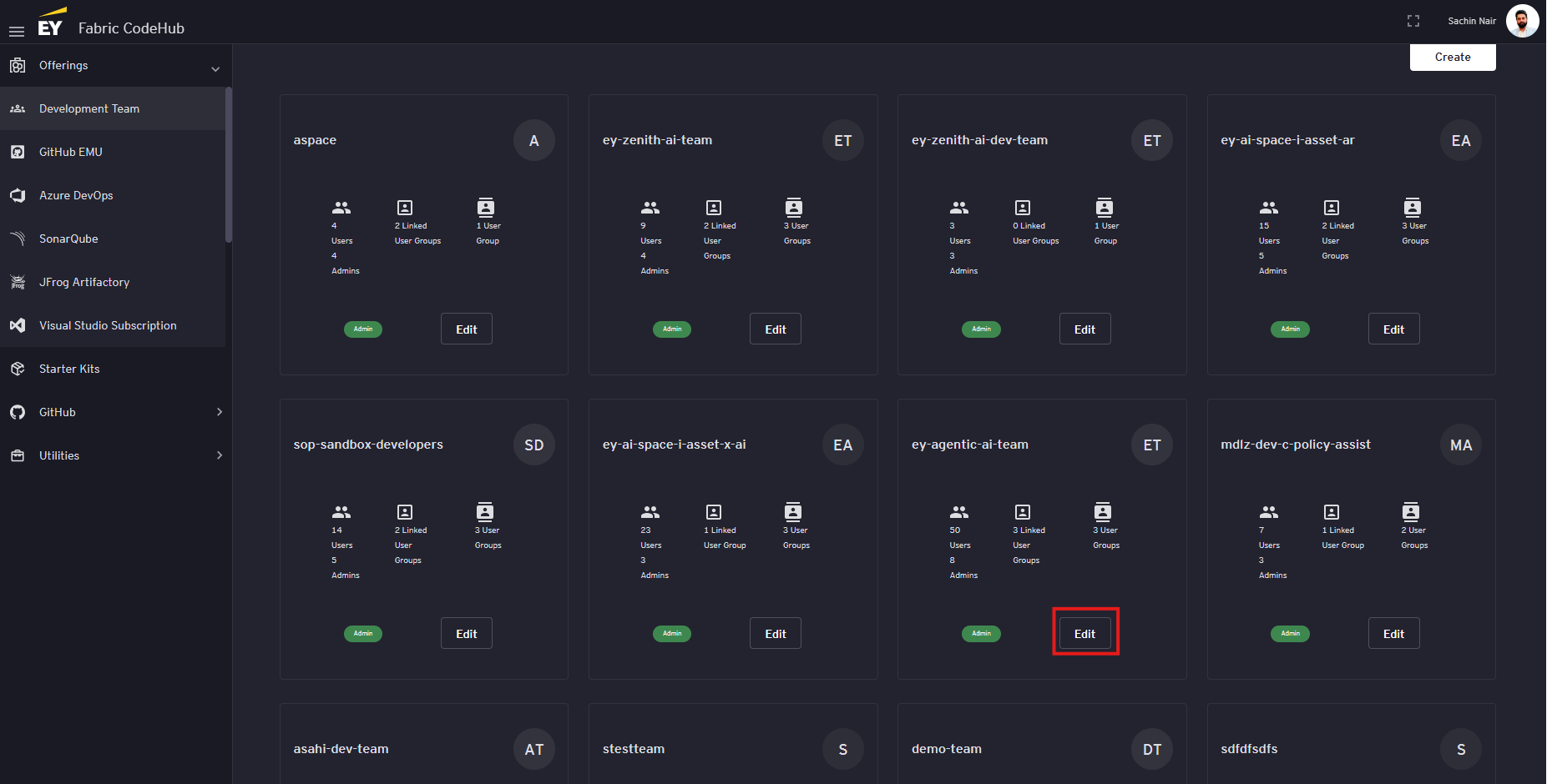 Click on the 'Edit' button on the development team the user needs to be added to.
