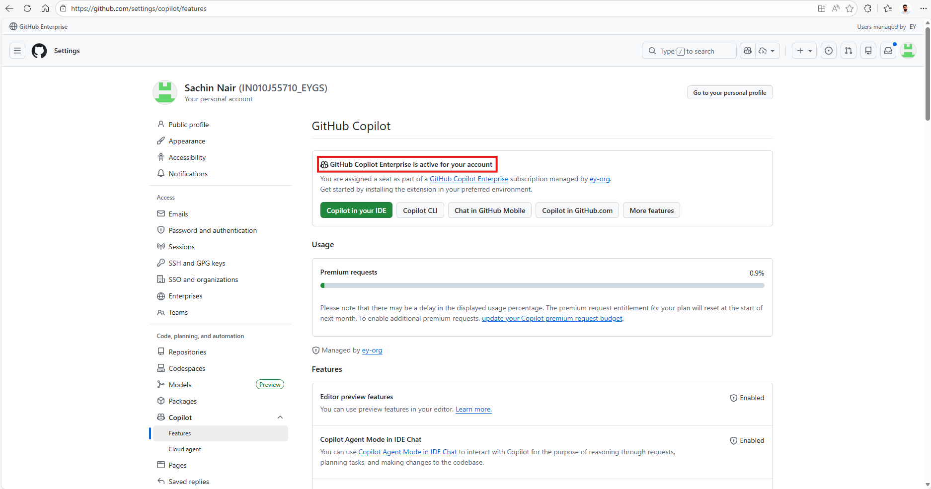 PREREQUISITE: A EY GitHub Enterprise account is required for raising Copilot access. The step for requesting and validating GitHub Enterprise account can be found at 'GitHub Enterprise Access' page