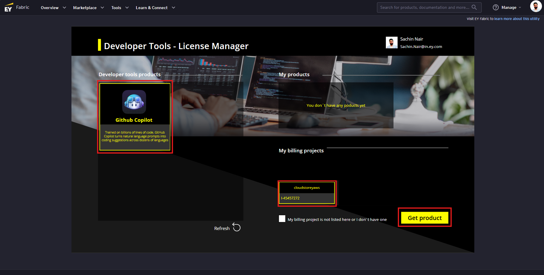 Click on the 'GitHub Copilot' card under the 'Developer tools products' section and then the billing project and finally on the 'Get Product' button (The 'Get Product' button is only visible once you have selected GitHub card and the project)
