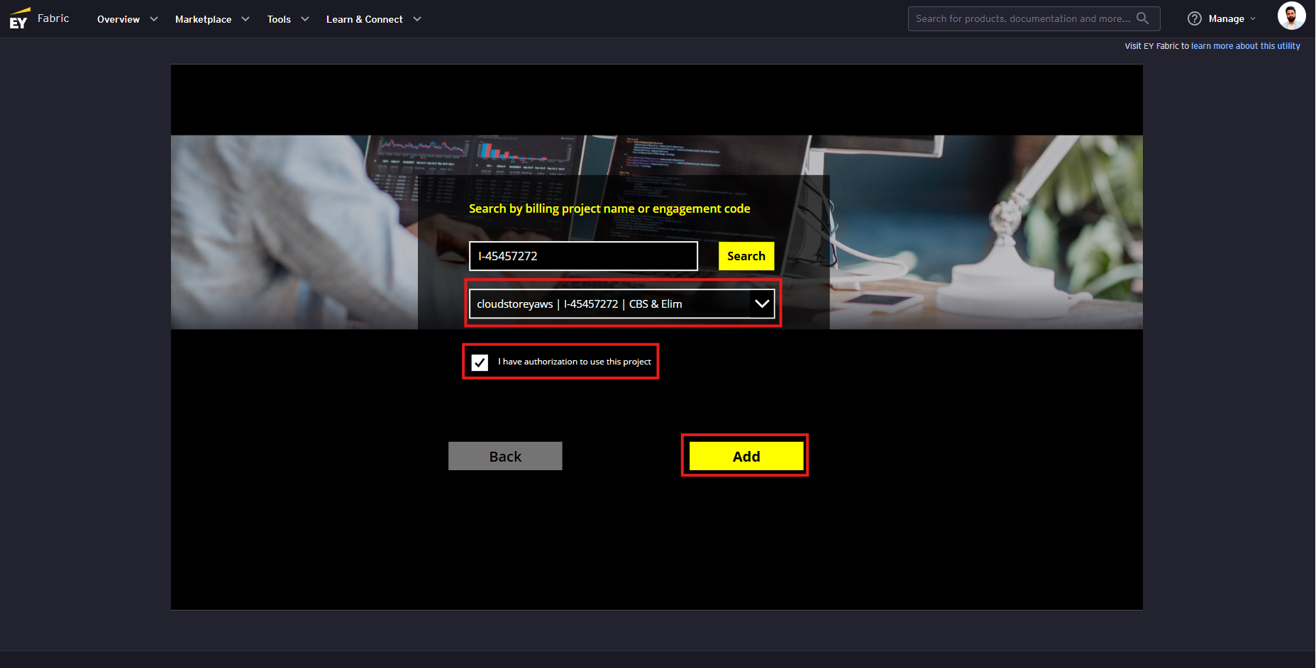 Once the project information loads, click on the 'I have authorization to use this project' checkbox and click on 'Add' button