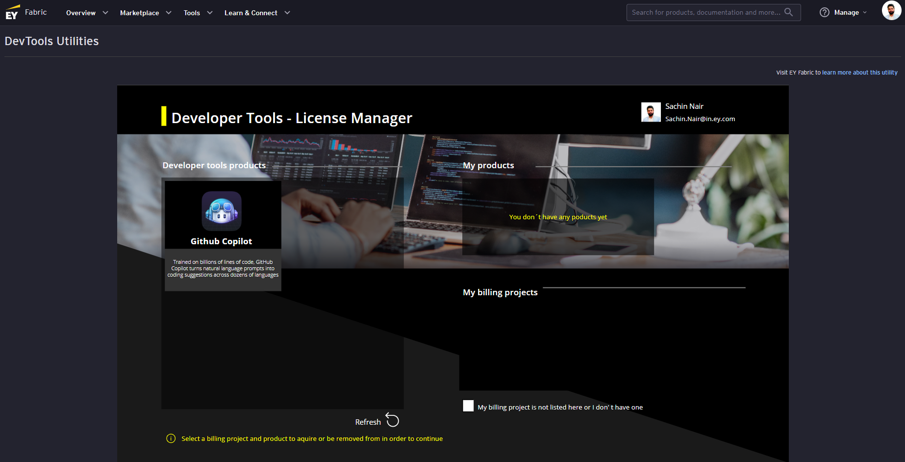 Click on the ‘GitHub Copilot License’ tab under the ‘Utilities’ section. This should open the 'Developer Tools - License Manager' page in a new tab
